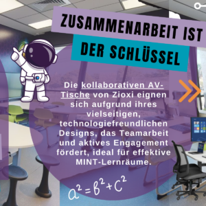 Durch den Einsatz von versenkbaren Monitorarmen oder klappbaren Arbeitsplätzen entsteht ein flexibler Arbeitsplatz, der Zusammenarbeit und interaktives Lernen fördert.