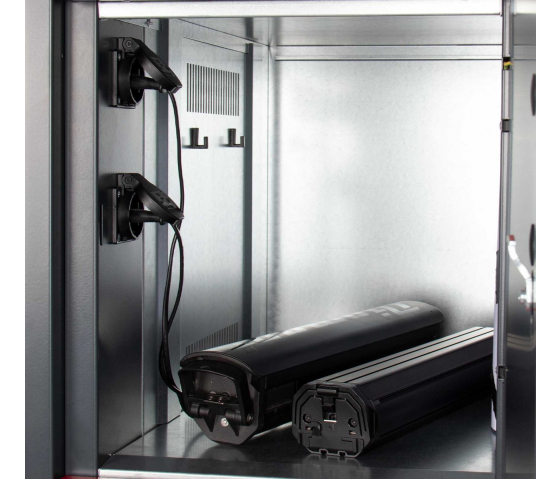 Mit bis zu 16 geräumigen Fächern ist dieser Laderaum für eine intensive Nutzung ausgelegt. Jedes Fach verfügt über zwei IP55-zertifizierte Steckdosen, so dass zwei Geräte pro Fach gleichzeitig aufgeladen werden können. Damit eignet sich der Laderaum ideal für Orte wie öffentliche Plätze, Arbeitsplätze oder Erholungsgebiete, an denen mehrere Nutzer Zugang zu sicheren Lademöglichkeiten benötigen. Praktische Aufhängehaken in jedem Fach bieten zusätzlichen Platz für die Aufbewahrung von Zubehör wie Gepäcktaschen oder Helmen.