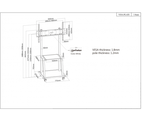 Mit einer AV-Ablage in den Maßen 554 x 448 x 20 mm und einer Ablage in den Maßen 775 x 675 x 30 mm, beide mit einer Tragfähigkeit von jeweils 20 kg, bietet dieser TV-Wagen ausreichend Platz für alle AV-Komponenten und Trägermaterialien. Das Produkt ist aus hochwertigen Materialien gefertigt und bietet eine lebenslange Garantie, die die Langlebigkeit und Qualität der Konstruktion bestätigt.