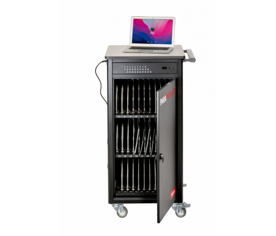 PARAPROJECT® Trolley C30 ist eine effiziente Lösung zum Aufbewahren und Aufladen von bis zu 30 Tablets, Chromebooks oder Laptops. Er verfügt über 30 nummerierte Staufächer, die sich auf drei Etagen verteilen, und wird mit 30 USB-C-Ladegeräten geliefert.