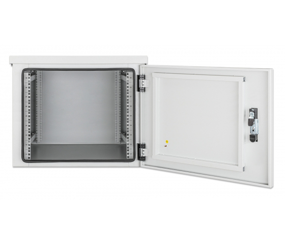 The wall cabinet is made of high-quality steel and with an antistatic powder coating, which ensures for a sturdy and durable construction. For added security, the door is equipped with a swing handle that features a three-point lock, complete with two included keys. The steel door opens to 120°, facilitating maintenance and access to your equipment. In addition, the cabinet is fully assembled, allowing you to get started right away with the installation.