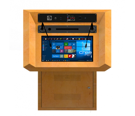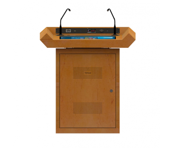 Multimedia Podium Milano Smart high-tech lectern in which various devices such as a touch monitor, a PC solution and more are integrated. This offers the user all possible ease of use and the audience an optimal presentation experience. A powerful PC has been placed in the housing to operate and manage the top screen. A remarkable detail is the extra space created by the cover of the touch screen in the reading panel. Also on the front side, the pulpit is equipped with a large 32-inch screen, which is perfect for the speaker to show information to his audience. The metal base gives the beautiful lectern not only its stability but also its timeless modern design.