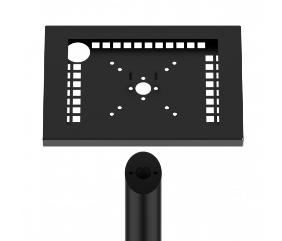 The tube is fixed with bolts onto a heavy square foot plate with screw holes in the corners for anchoring to the floor. The pole is hollow and provides space for cable management. WiFi signal and sound are not disturbed or affected by the tablet holder.