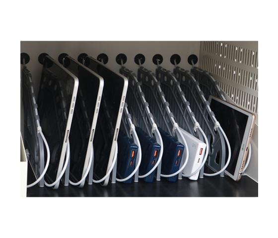 El carro de carga Bravour® está diseñado para almacenar de forma segura dispositivos de hasta 16 pulgadas y cargarlos. Se adapta sin esfuerzo a portátiles y Chromebooks de hasta 16 pulgadas, y a tabletas de diferentes tamaños de pantalla. Incluso las tabletas con fundas gruesas pueden colocarse en este carro sin dificultad, por lo que los usuarios no tienen que desembalar sus dispositivos para cargarlos. Esto aumenta la facilidad de uso y reduce el riesgo de daños al retirar y colocar las fundas.