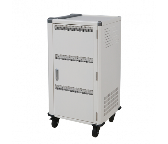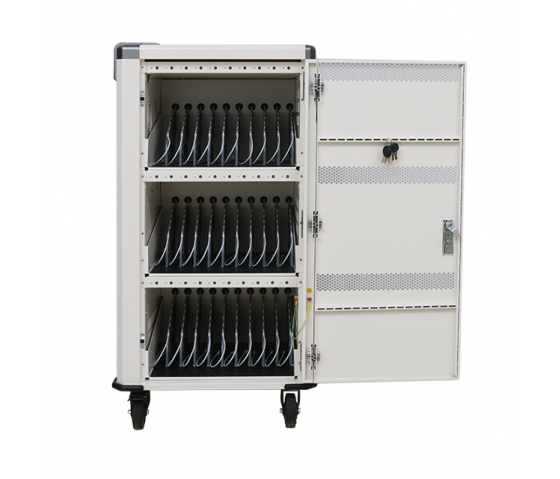 El exterior del carro de recarga es de acero resistente, lo que proporciona la máxima protección a los dispositivos que se encuentran en su interior. Para mayor seguridad, el carrito está equipado con una cerradura con llave. La construcción de acero y las opciones de bloqueo garantizan un almacenamiento seguro de los dispositivos cuando el carro no está en uso, lo que es especialmente importante en zonas de mucho tráfico.