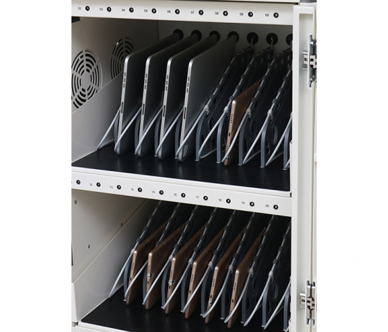 Además del temporizador, el carro tiene ventiladores activos que pueden ajustarse a una temperatura específica. Una vez que la temperatura en el interior del armario alcanza este valor, los ventiladores se encienden automáticamente para mantener los dispositivos fríos durante la carga. Esto evita el sobrecalentamiento, lo que favorece la seguridad y el rendimiento de los dispositivos y minimiza el riesgo de daños. Esta función es especialmente útil cuando se cargan varios dispositivos durante largos periodos de tiempo, como en los días de colegio u oficina.