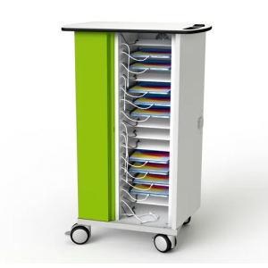 Le Zioxi CHRGT-PT-32-C a été conçu dans un souci de facilité d'utilisation et de durabilité. Le chariot est compact et équipé de roues à roulement souple, ce qui le rend facile à déplacer. Les portes du chariot peuvent être ouvertes à 270 degrés et restent en place grâce à des fermetures magnétiques, ce qui permet d'accéder facilement et en toute sécurité aux iPads et aux stylets. La finition du chariot est en MDF mélaminé blanc avec un couvercle en acier vert citron pour le compartiment électrique, ce qui offre non seulement un aspect élégant, mais est également facile à nettoyer.