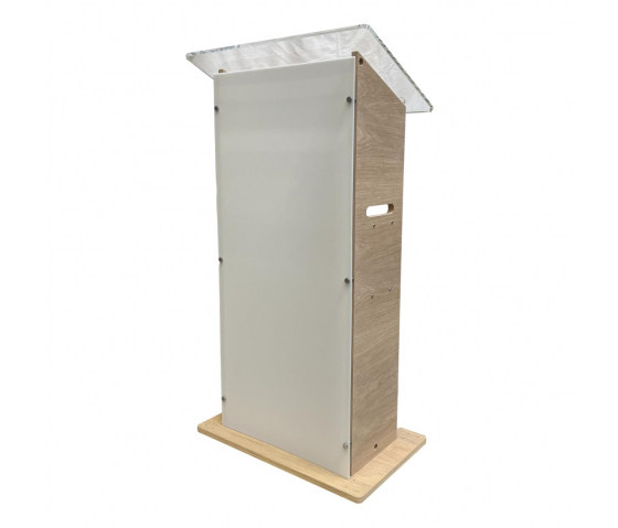Le pupitre de conférence Esmeralda est équipé de panneaux latéraux et d'une base en couleur noyer, ce qui, en combinaison avec un plateau de lecture transparent, lui confère une allure élégante. Nous pouvons également personnaliser et apposer un logo personnalisé sur l'avant du pupitre pour la mise en valeur de votre entité.
