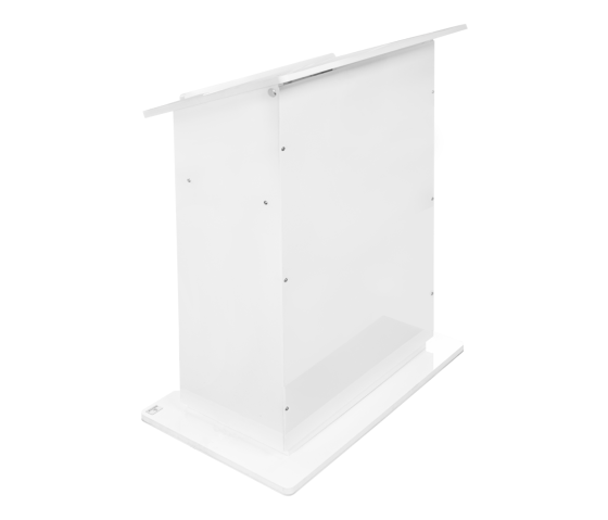 Le HiLo est un pupitre électronique réglable en hauteur et en continu entre 600 mm et 1100 mm, disponible en noir mat et en blanc. Il s'agit d'un meuble de présentation stable et élégant qui convient à une grande variété de lieux, tels que les centres de conférence, les amphithéâtres, les établissements d'enseignement et les édifices religieux.