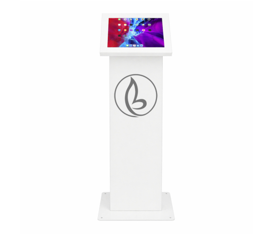 La colonne pour tablettes entièrement métallique présente une stabilité exceptionnelle et est disponible en deux couleurs, blanc et noir. Le boîtier est conçu de manière à pouvoir être utilisé universellement pour plusieurs marques et tailles de tablettes.