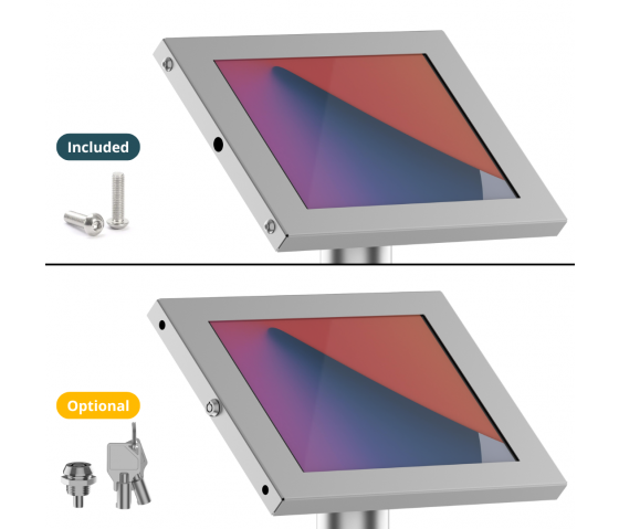 Il porta tablet può essere bloccato con 2 bulloni e per sicurezza supplementare è possibile aggiungere una chiusura a pressione. Il supporto è montato su una base, una piastra per i piedi e un tubo di 60 mm di diametro, con un comodo angolo di visione di 45 gradi. Il tubo è imbullonato a una pesante piastra di base quadrata con fori negli angoli per l'ancoraggio al pavimento. Il palo è cavo e offre Spazio per la gestione dei cavi. Il Il segnale Wi-Fi e il suono non sono disturbati o influenzato dal supporto della tavoletta;