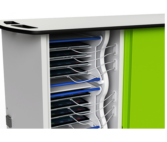 Bärkorgarna är lätta, starka och försedda med två handtag, vilket gör dem lätta att lyfta - även för barn. Korgarna kan placeras i sidled i vagnen, vilket gör det enkelt och säkert att ta ut och sätta tillbaka iPads. Smart kabelhantering säkerställer att endast en kort bit USB-kabel är synlig per enhet, så att allt hålls snyggt och prydligt.